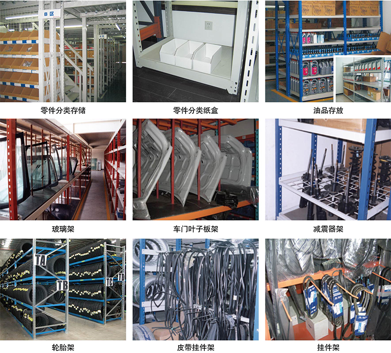 全组合式结构,针对汽车行业备件特点,分为:小件架、中件架、大件架、玻璃架、车门架、轮胎架、挂件架、减震器架、消音器架、油料架、保险杠架等;单元货架每层承重为200-400kg不等。